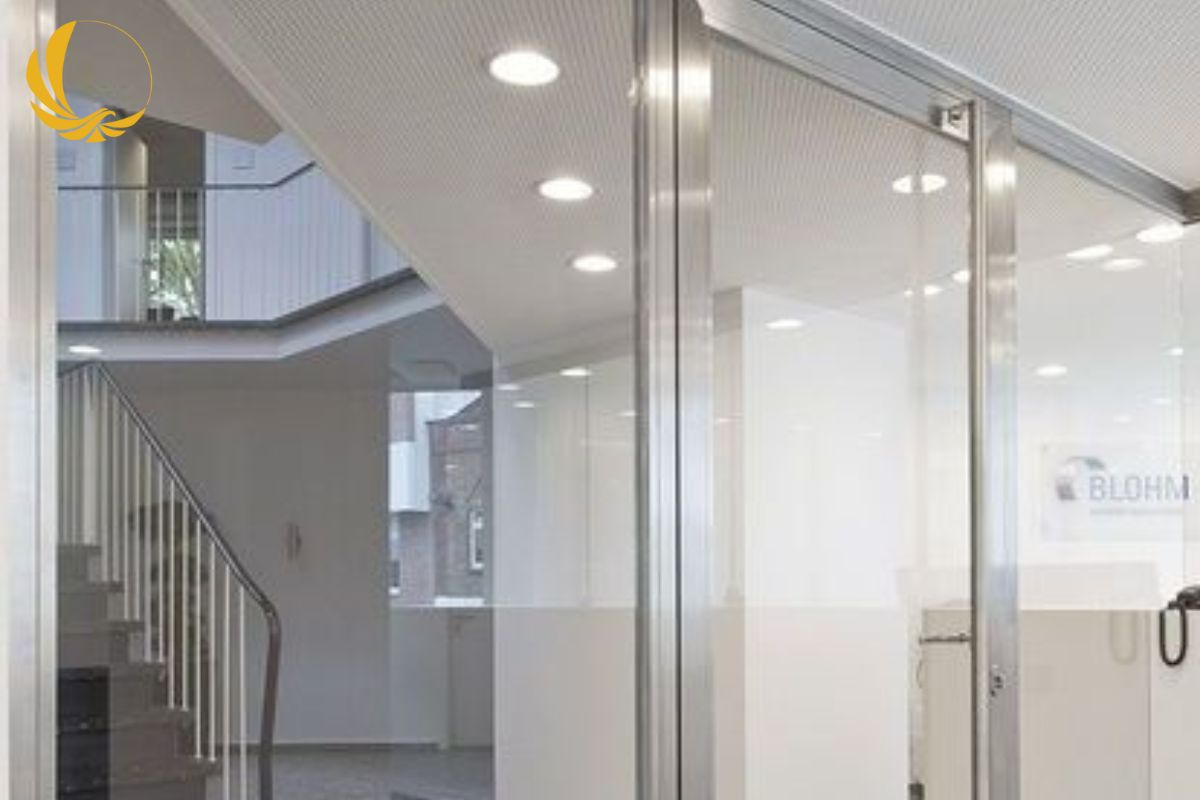 Mẫu 5: Mẫu vách kính cố định nhôm xingfa kết hợp cửa kính thuỷ lực